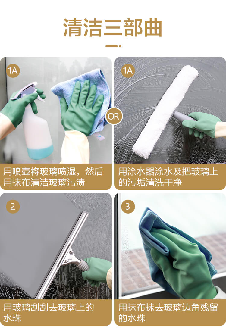 玻璃刮的操作流程主要有沾水刮擦、均勻用力、注意放置等幾步,具體操作如下: